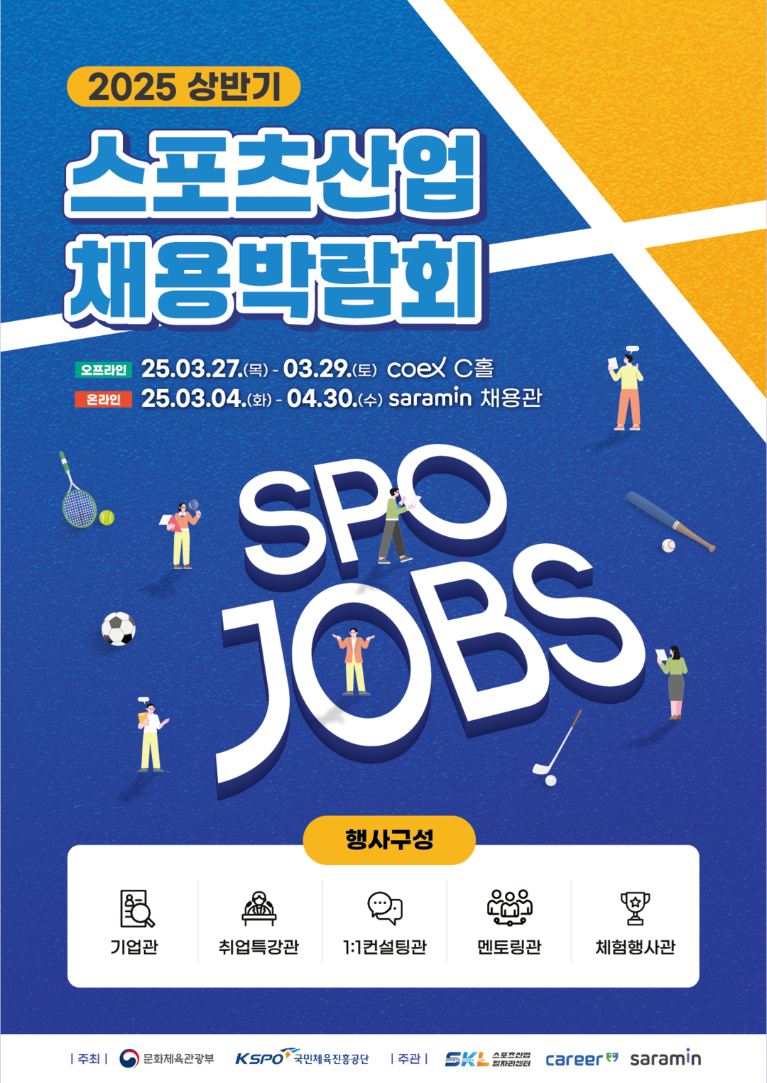 문화체육관광부와 국민체육진흥공단이 주최하는 ‘2025 상반기 스포츠산업 채용박람회’는 3월 27일(목)부터 3월 29일(토)까지 서울 코엑스 C홀에서 개최되며, 온라인 채용관은 3월 4일(화)부터 4월 30일(수)까지 사람인 플랫폼에서 운영될 예정이다.