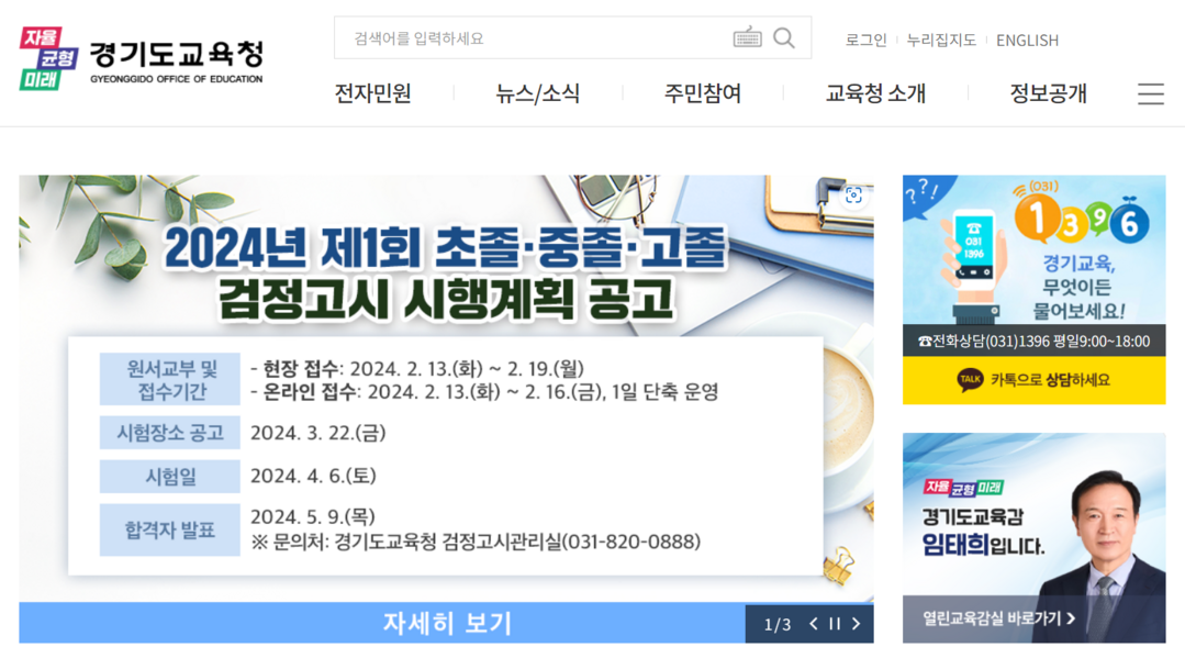 경기도교육청(교육감 임태희)이 ‘2024년도 제1회 초졸·중졸·고졸 검정고시 시행계획’을 통해 이달 13일(화)부터 19일(월)까지 원서접수를 진행한다고 밝혔다.