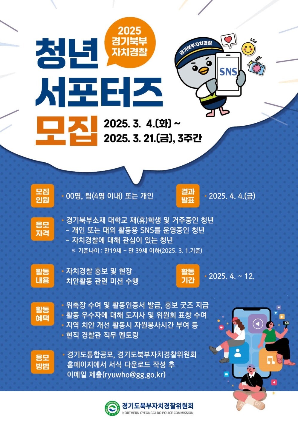 서포터즈 모집은 3월 21일까지 진행되며, 지원을 희망하는 청년은 경기도북부자치경찰위원회 공식 누리집의 공고문을 확인한 후, 서포터즈 담당자 이메일(ryuwho@gg.go.kr)로 신청서를 제출하면 된다.