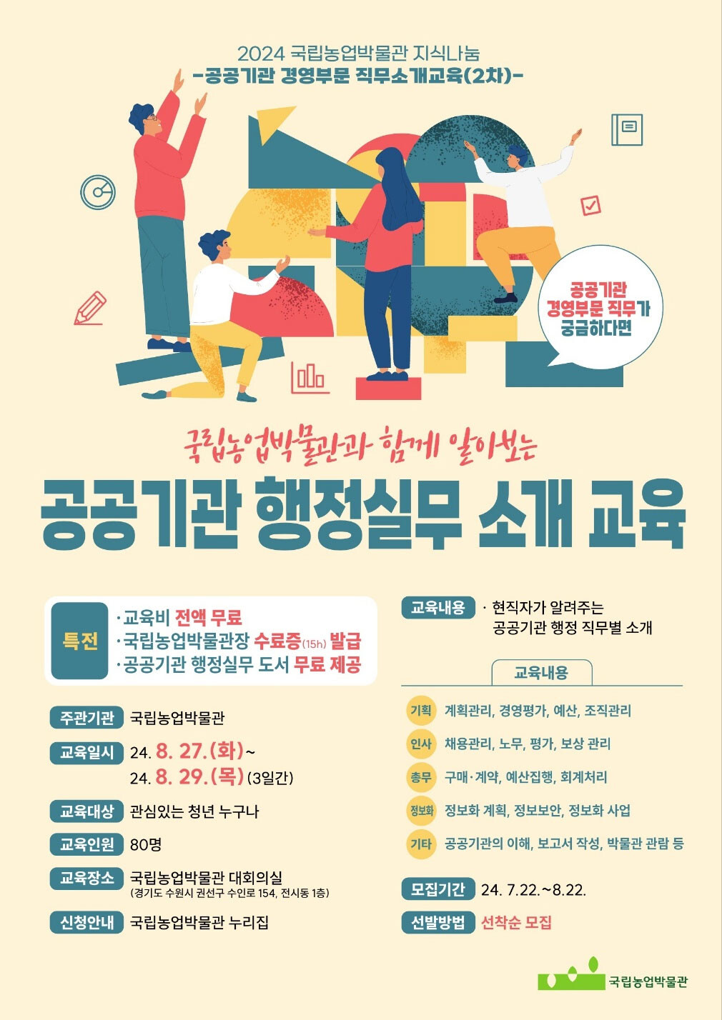 국립농업박물관(관장 황수철, 이하 박물관)은 8월 27일부터 29일까지 3일간 박물관 대회의실에서 2차 ‘공공기관 행정실무 소개 교육’을 추진한다.