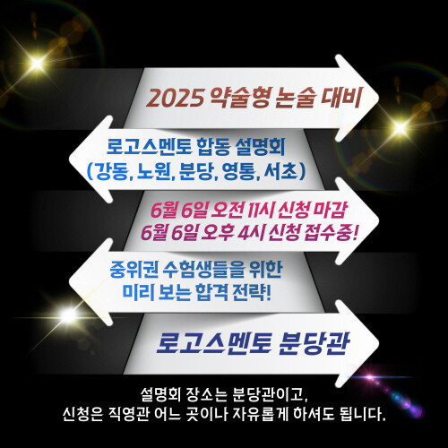 로고스멘토학원은 오는 6월 6일 오전 11시에 개최되는 약술형 논술 설명회의 신청이 조기 마감돼 오후 4시에 설명회를 추가로 마련하고, 신청 접수를 받는다.