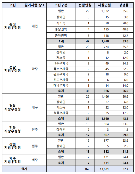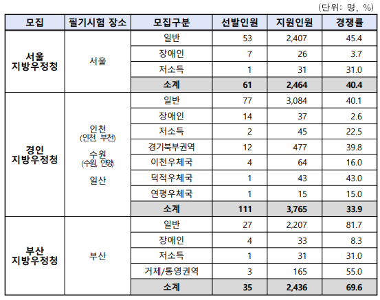 각 지방우정청별 접수 현황을 보면 ▲서울청 40.4대 1(61명 선발/2,464명 지원) ▲경인청 33.9대 1(111명 선발/3,765명 지원) ▲부산청 69.6대 1(35명 선발/2,436명 지원) ▲충청청 33.8대 1(42명 선발/1,420명 지원) ▲전남청 26.5대 1(35명 선발/926명 지원) ▲경북청 43.3대 1(36명 선발/1,560명 지원) ▲전북청 29.8대 1(17명 선발/507명 지원) ▲강원청 21.2대 1(18명 선발/382명 지원) ▲제주청 24.4대 1(7명 선발/171명 지원)로 집계됐다.