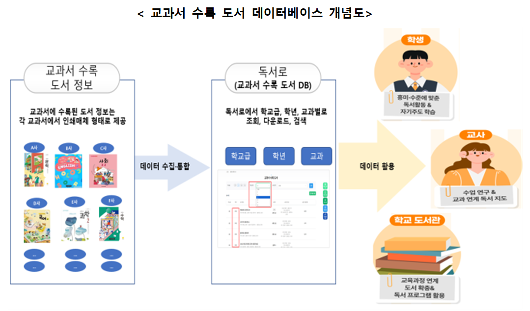 그동안 교과서에 수록된 도서 목록은 각 교과서 부록 등의 인쇄자료에서만 확인 가능해 학년별·교과별로 정보를 통합하거나 활용하는 데 어려움이 있었다. 이에 교육부는 16개 교과서 발행사와 협력해 관련 정보를 체계적으로 정리한 데이터베이스를 구축하고, 이를 독서교육통합플랫폼 ‘독서로’를 통해 제공하기로 했다.