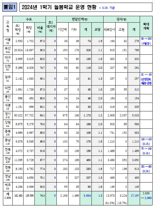 특히, 4월 중에 서울은 38곳에서 최대 150곳까지 늘봄학교를 늘리고, 광주는 32곳에서 45곳까지 확대할 계획으로, 전체 초등학교의 48%(약 2,963개교)가 늘봄학교를 운영한다.