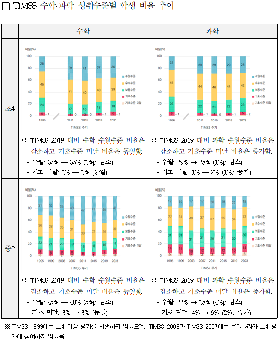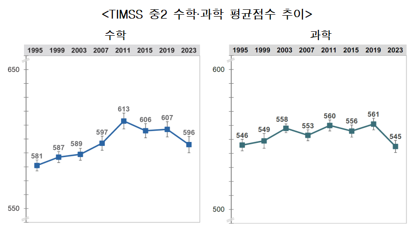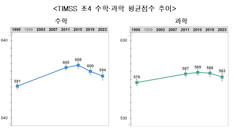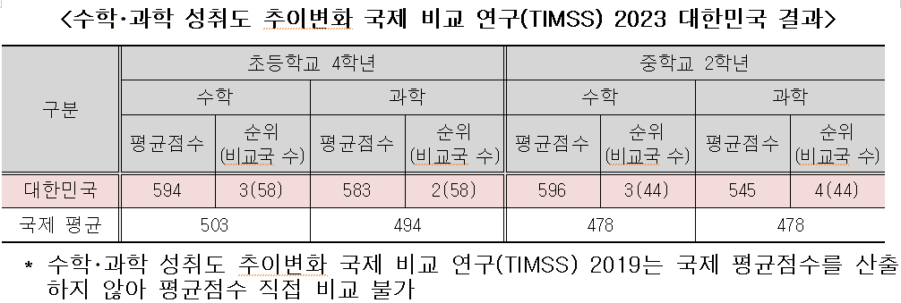 2023 TIMSS에는 한국에서 초등학교 4학년 4,461명, 중학교 2학년 4,487명이 참여했다. 초등학생 수학 성취도 평균은 594점으로 싱가포르(636점), 대만(612점)에 이어 세계 3위를 기록했으며, 과학 성취도 평균은 583점으로 싱가포르(625점) 다음으로 높았다. 중학생은 수학에서 596점(3위), 과학에서 545점(4위)으로 글로벌 상위권을 유지했다.