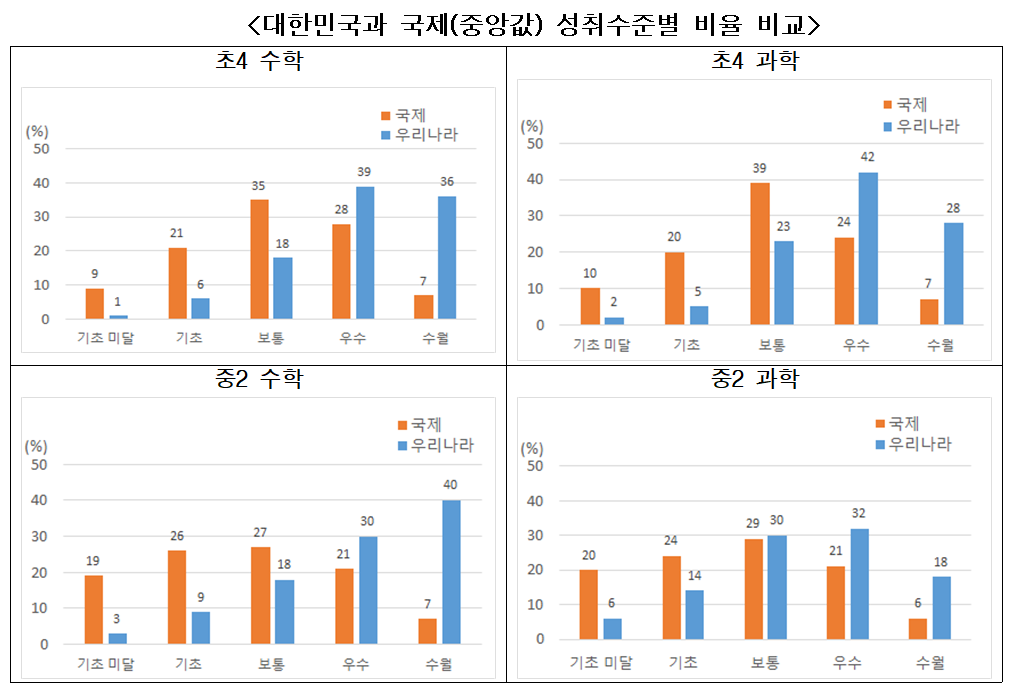 특히 초등학생의 경우 수월 수준(625점 이상)에 해당하는 비율이 수학에서 36%, 과학에서 28%로 나타나 국제 중앙값(7%)을 크게 초과했다. 중학생 또한 수학 수월 수준 비율이 40%(국제 중앙값 7%), 과학은 18%(국제 중앙값 6%)로 높은 성취를 보였다.