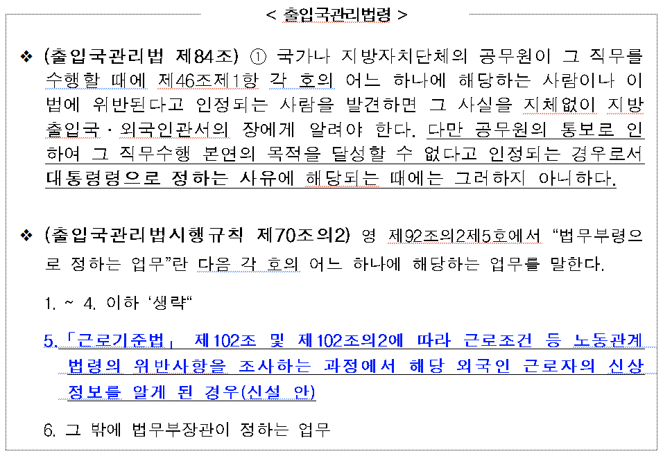 현행 출입국관리법 제84조는 공무원이 직무 수행 중 불법체류 사실을 알게 되면 반드시 지방 출입국·외국인관서에 통보하도록 규정하고 있다. 그러나 이로 인해 외국인 근로자가 체불임금 피해를 당해도 불이익이 두려워 신고를 포기하는 문제가 지속적으로 지적돼 왔다.