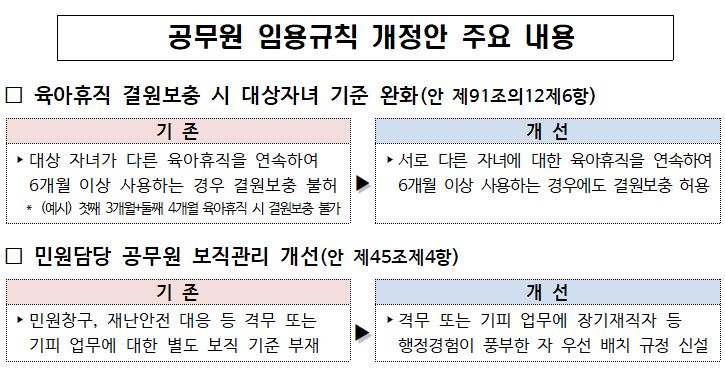 연원정 인사처장은 “이번 개정안은 공무원의 출산·양육 친화적인 환경을 조성하고, 민원담당 공무원 보호를 강화하기 위한 것”이라며, “앞으로도 현장의 의견을 반영한 제도 개선으로 공직사회를 혁신하겠다”고 밝혔다.