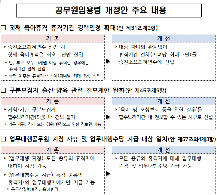 앞으로 공무원은 자녀당 최대 3년까지 사용할 수 있는 육아휴직 기간 전체를 승진을 위한 근무 경력으로 인정받는다. 기존에는 첫째 자녀 육아휴직은 최대 1년까지만 인정하고 둘째 자녀부터 전체 기간을 경력으로 산정했으나, 이번 개정안으로 모든 자녀에 대해 동일한 기준이 적용된다.