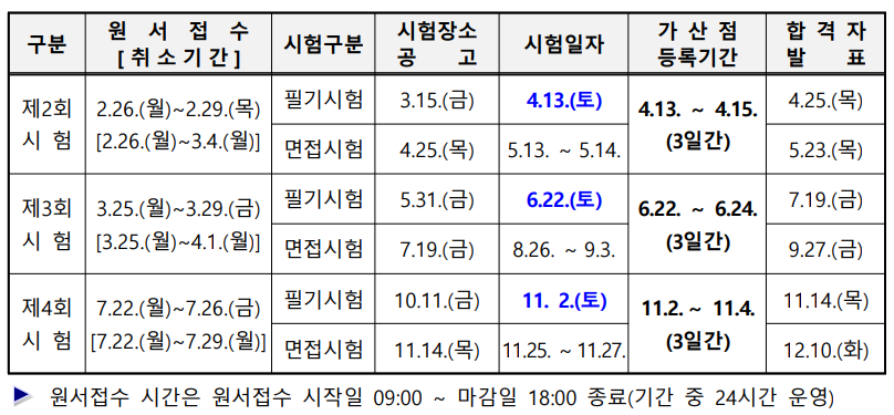 채용인원이 가장 많은 9급 공채의 경우 원서접수는 3월 25일(월)부터 29일(금)까지 진행하고 필기시험은 6월 22일(토) 시행 후 합격자는 7월 19일(금)에 결정한다. 면접시험은 8월 22일(월)부터 9월 3일(금)까지 진행한 후 9월 27일(금) 최종합격자를 발표한다.