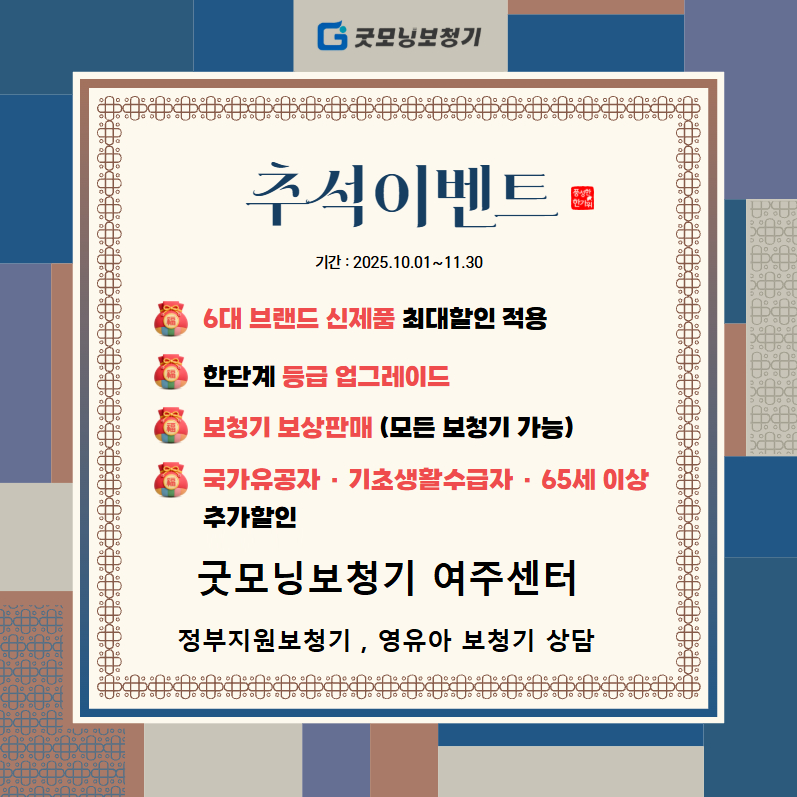 10월 1일부터 11월 30일까지 두달 간 진행되는 이번 할인이벤트는 '청력은 한 번 잃으면 다시 돌아오지 않습니다. 보청기는 착용 시기가 곧 생명입니다. 고민하는 사이 청력 손실은 진행되기에 망설일 이유가 없습니다'라는 굿모닝보청기 여주점의 메시지를 담아 기획된 행사다.