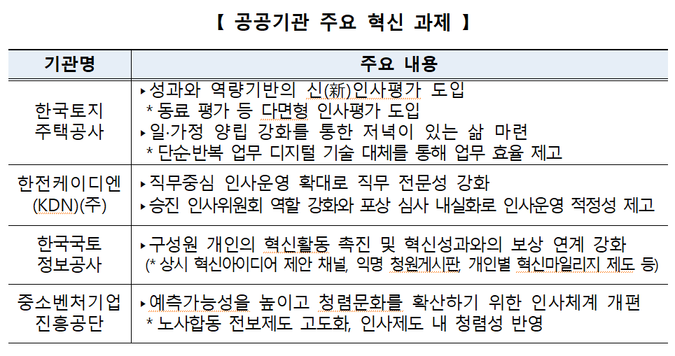한국토지주택공사는 기존의 하향식 평가를 탈피하고 동료 전체가 인사 평가에 참여하는 다면형 인사평가제도를 도입하는 과제를 발표했다. 또한, 일·가정 양립을 강화하기 위해 단순·반복 업무를 디지털 기술로 대체하는 방안도 제시했다.