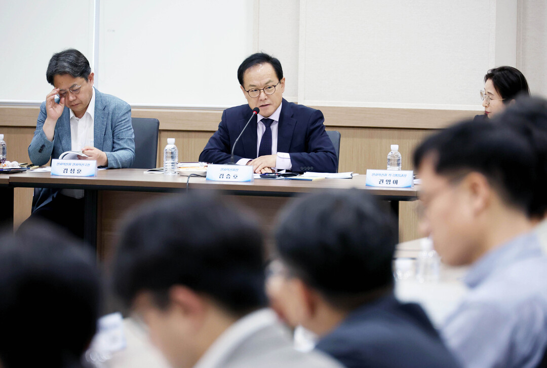 <김승호 인사혁신처장이 18일 대전 유성구 한국조폐공사에서 열린 '제19차 공공기관 인사혁신 협의체 회의'에서 참석자들과 공직문화 혁신 추진에 대한 의견을 나누고 있다.>