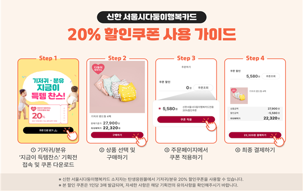 서울시는 신한 다둥이 행복카드 소지자를 대상으로 기저귀·분유 20% 할인쿠폰을 제공한다. 쿠폰은 신한카드 및 LG CNS 후원을 통해 마련됐으며, 10일부터 발급이 시작됐다.