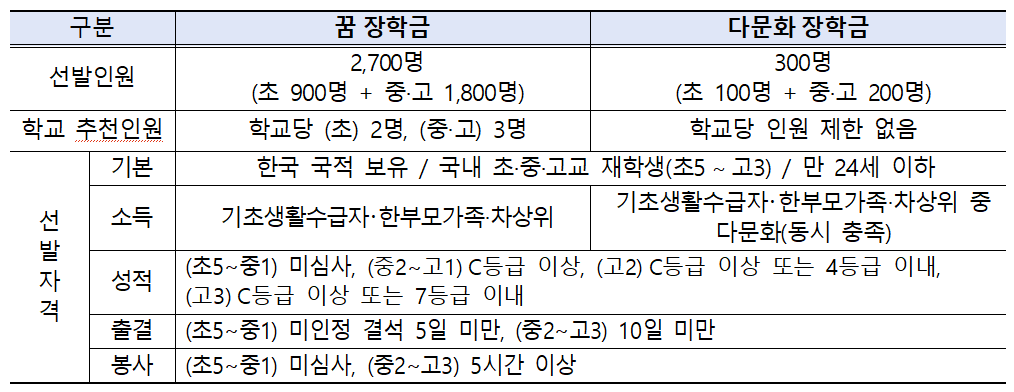 올해 선발 인원은 총 3,000명 규모다. 세부적으로는 일반 저소득층 학생을 대상으로 하는 ‘꿈 장학금’으로 2,700명을 선발하며, 다문화 가구 학생을 위한 ‘다문화 장학금’ 전형으로 300명을 뽑는다. 학교급별로는 꿈 장학금의 경우 초등학생 900명과 중·고등학생 1,800명을, 다문화 장학금은 초등학생 100명과 중·고등학생 200명을 각각 배정했다.