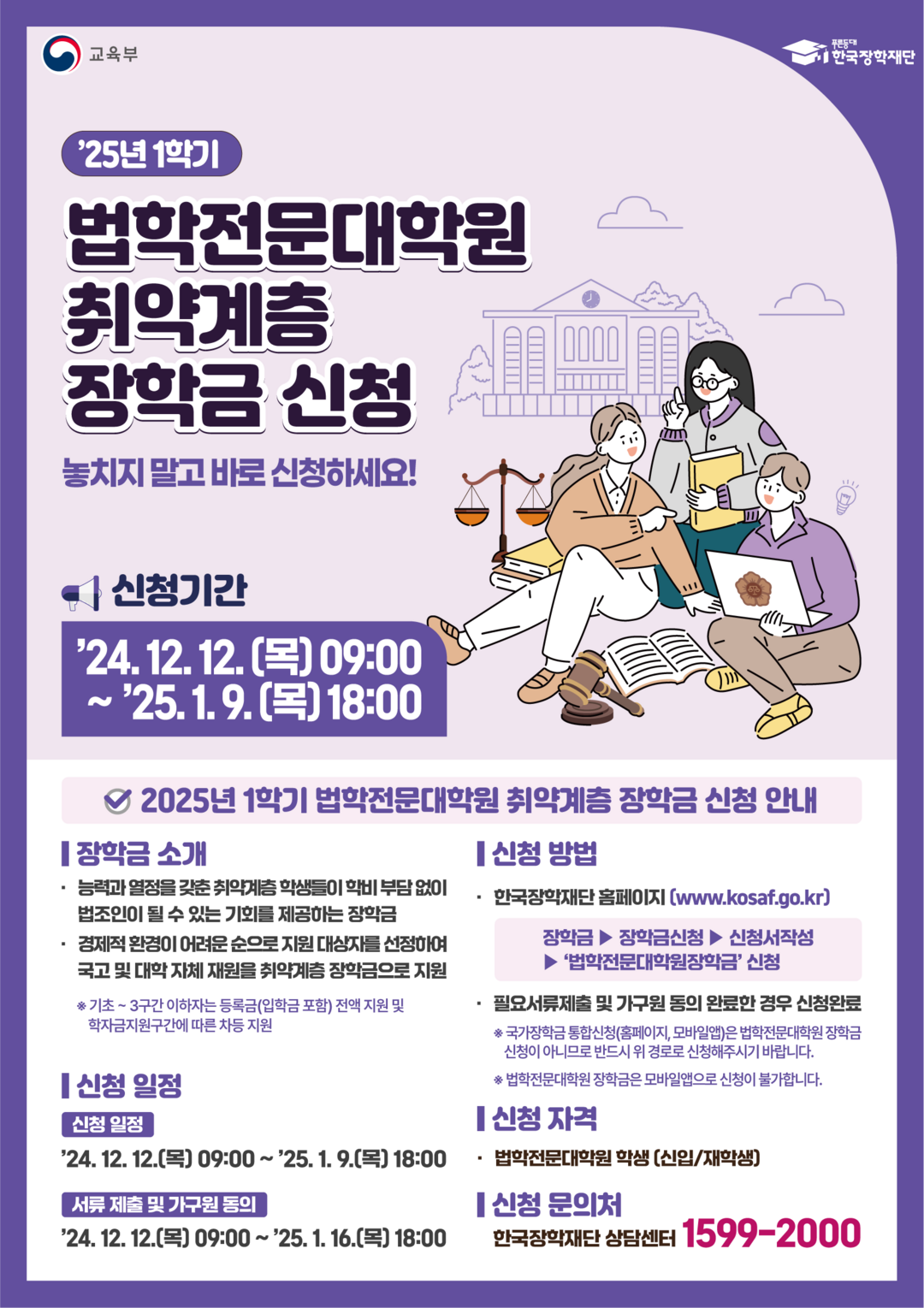 신청 기간은 12월 12일 오전 9시부터 2025년 1월 9일 오후 6시까지다. 법학전문대학원 신입생과 재학생 모두 한국장학재단 홈페이지에서 신청할 수 있다. 신청 후에는 2025년 1월 16일까지 필요한 서류를 제출하고 가구원 정보 제공에 대한 동의 절차를 완료해야 한다.