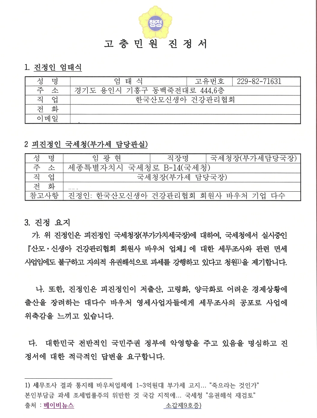 “최근 티몬 사태 사업자 부가세 환급, 폐업 소상공인 구직지원금 비과세 결정 등 국세청은 세법을 기계적으로 적용하지 않고 국민 입장에서 적극적으로 해석해 왔다. 바우처 방식의 산모·신생아 돌봄 서비스는 본인부담금을 반드시 지불해야 이용 가능한 서비스인데, 여기에 부가세를 부과하는 것은 불합리한 측면이 있다.”