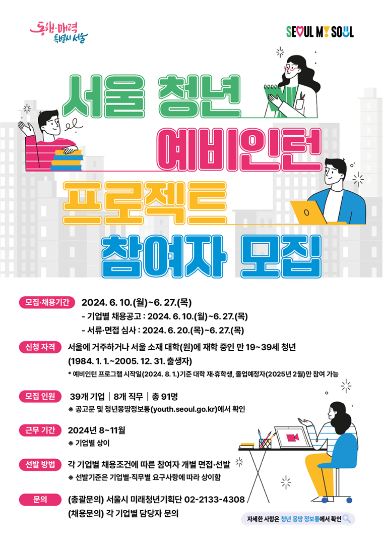 최종 선발된 예비인턴은 8월부터 11월까지 최대 4개월간 각 기업에서 실무경험을 쌓게 되며, 근무기간 중 급여(월 약 206만 원, 2024년 최저임금 세전 금액)와 4대 보험 가입은 서울시가 지원한다.