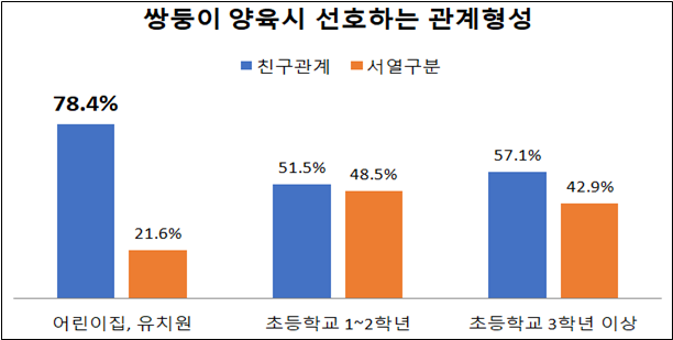 설문에 따르면, 쌍둥이 부모의 68.9%가 자녀 간 동등한 친구 관계를 선호한다고 응답했다. 반면, 31.1%는 서열 구분을 지지했다. 특히 어린이집·유치원 연령의 자녀를 둔 부모는 친구 관계를 선호하는 비율(78.4%)이 높았으나, 초등학교 고학년으로 갈수록 친구 관계와 서열 구분 간 격차가 점차 줄어드는 경향을 보였다.