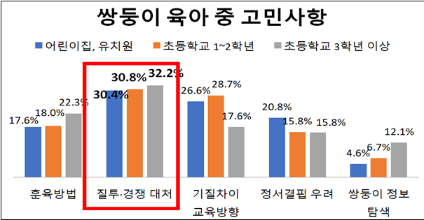 교육에서의 주요 고민으로는 쌍둥이 간 질투 및 경쟁의식 대처(30.7%)가 가장 높았다. 이어 △기질 차이에 따른 교육 방향 설정(25.8%), △애정 분배로 인한 정서적 결핍 우려(19.4%) 등이 뒤를 이었다.