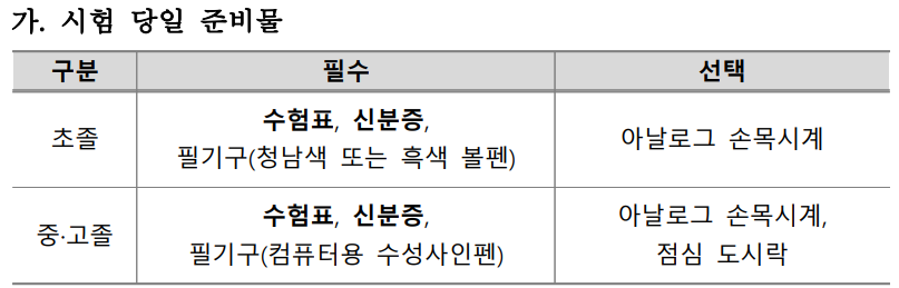 중·고졸의 경우 준비물은 수험표와 신분증, 그리고 컴퓨터용 수성사인펜을 지참해야 하고, 아날로그 손목시계와 점심 도시락은 선택사항이다.