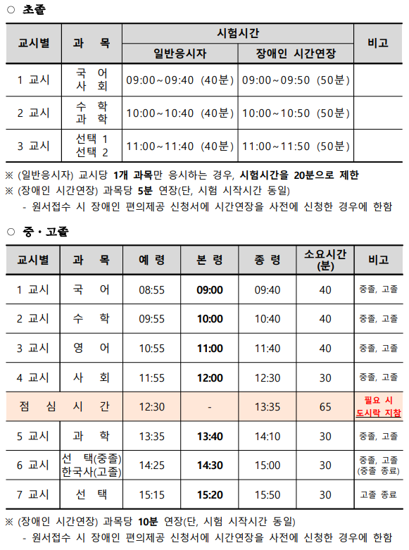 초졸 준비물-수험표·신분증·필기구(청남색 또는 흑색 볼펜) / 중·고졸-수험표·신분증·컴퓨터용 수성사인펜