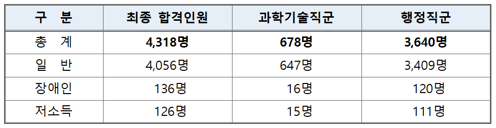 직군별로는 과학기술직군에서 678명(15.7%)이, 행정직군에서는 3,640명(84.3%)이 합격했다.