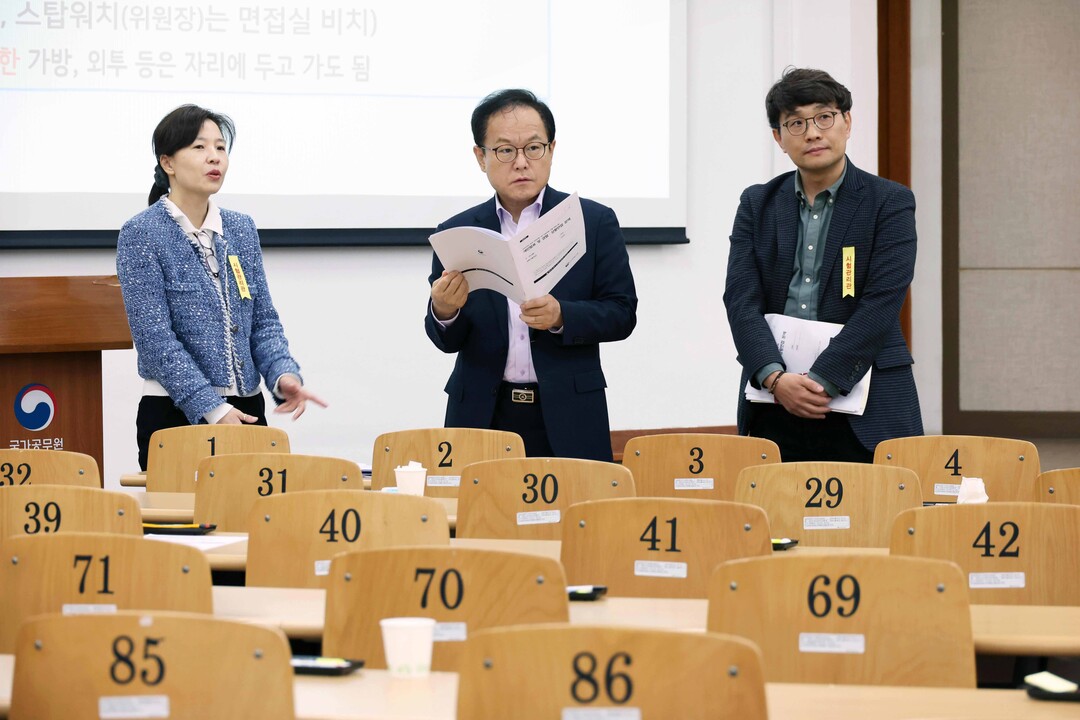 <김승호 인사혁신처장이 5월 10일 '2024년도 전국 지역인재 7급 수습직원 선발 면접시험'이 치러진 경기도 과천 국가공무원인재개발원을 방문해 시험 상황을 점검하고 있다.>