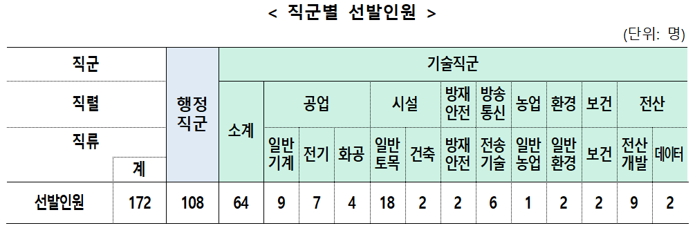 이번 최종합격자는 행정직군 108명, 과학기술 직군 64명이다.