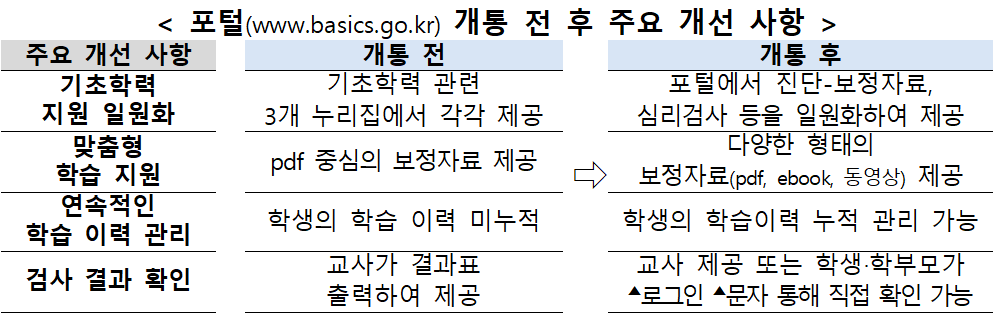 포털은 기존 시스템의 기능을 유지하면서도 일부 기능을 보완했다. 교육행정정보시스템(NEIS)과 연계해 학생의 학습 이력을 지속적으로 관리할 수 있도록 했고, 진단 결과에 따라 개인별 학습자료를 자동으로 연계하는 기능도 강화했다. 교육부는 이를 통해 기초학력 지도 과정에서 교사가 자료를 선별·제공하는 부담이 줄어들 것으로 보고 있다.