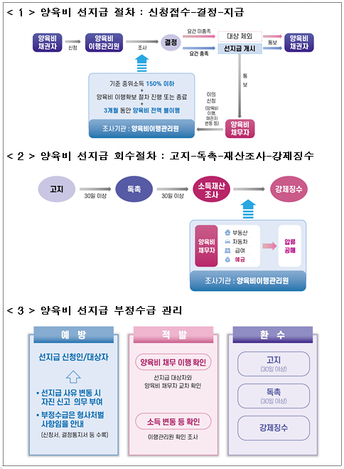 양육비 선지급제는 양육비를 받지 못하는 한부모 가정이 국가에 신청하면, 정부가 먼저 양육비를 지급하고 이후 양육비 채무자로부터 강제 회수하는 방식으로 운영된다.