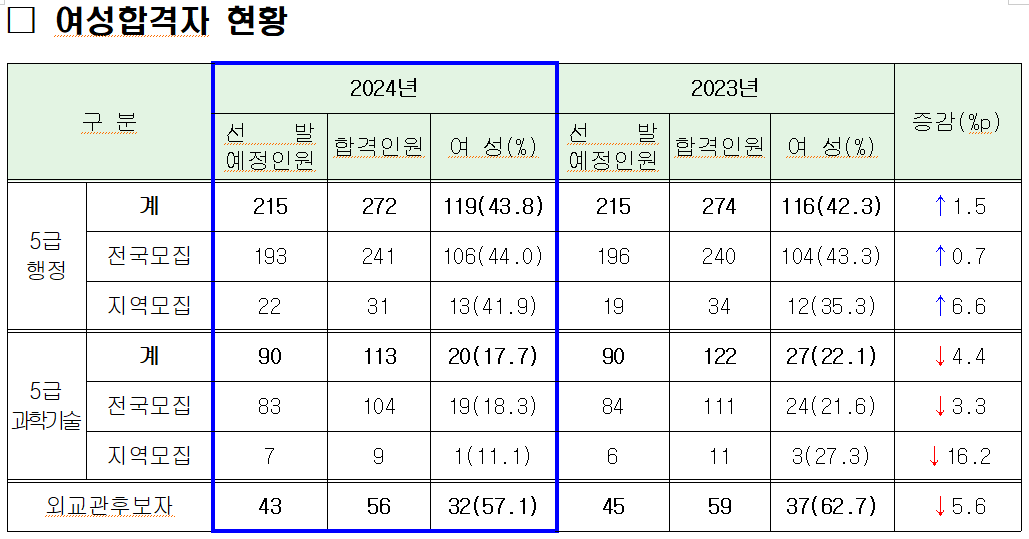 최근 6년간 5급 여성 비율을 살펴보면, 5급 행정직은 2019년(39.7%), 2020년(41.2%), 2021년(40.9%), 2022년(42.4%), 2023년(42.3%), 2024년(43.8%)로 꾸준히 증가하고 있고, 과학기술직은 2019년(27.0%), 2020년(21.7%), 2021년(25.7%), 2022년(18.3%), 2023년(22.1%), 2024년(17.7%)로 감소하고 있다.