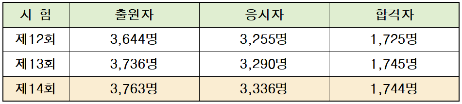 이는 전년도 제13회 시험의 출원자 3,736명, 응시자 3,290명, 합격자 1,745명과 비교했을 때 유사한 규모로, 응시자 수는 소폭 증가했으나 합격자 수는 1명 줄었다.