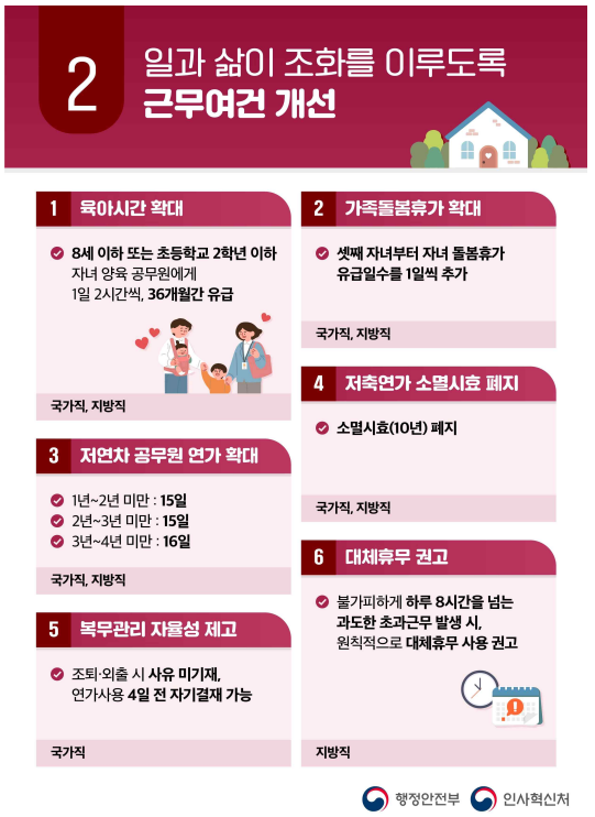 기존 5세 이하 자녀 양육 공무원에게 24개월 동안 1일 2시간씩 부여하던 육아시간을 8세 이하 또는 초등학교 2학년 이하 자녀 양육 공무원에게 하루 2시간씩 36개월 동안 부여한다. 또한 다자녀 공무원의 자녀 돌봄을 위해 셋째 자녀부터는 자녀 돌봄휴가 유급일수를 1일씩 추가한다.