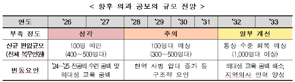 복지부는 공보의 감소가 단기간에 해소되기 어렵다고 보고 있다. 현역병 복무기간은 18개월인 반면 공보의 복무기간은 36개월로 차이가 크고, 의대 내 여학생 비율 증가와 의대생 군 휴학 확대가 겹치면서 공보의 부족은 2031년까지 이어질 가능성이 높다.