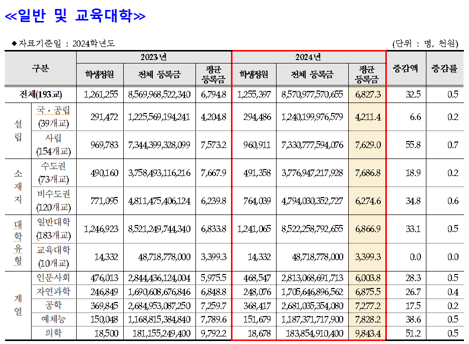 올해 4년제 대학 평균등록금은 전년 대비 32만5천 원(0.5%) 상승한 682만7천3백 원으로 나타났다. 이 중 166개(86.0%) 대학은 동결했으며, 13.5%인 26개 대학은 등록금을 인상했다. 반면, 1개 대학만 등록금을 인하한 것으로 밝혀졌다.