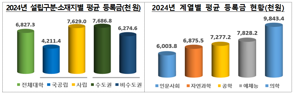 계열별로는 의학계열이 평균등록금 984만3천4백 원으로 가장 높았고, 예체능 782만8천2백 원, 공학 727만7천2백 원, 자연과학 687만5천5백 원, 인문사회 600만3천8백 원 순으로 나타났다.