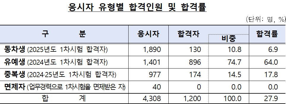 응시자 유형별로는 유예생(전년도 1차 합격자)이 896명(74.7%)으로 가장 많았고, 중복생 174명(14.5%), 동차생 130명(10.8%)이 뒤를 이었다. 반면 업무경력으로 1차 시험을 면제받은 지원자(40명)는 단 한 명도 합격하지 못했다.