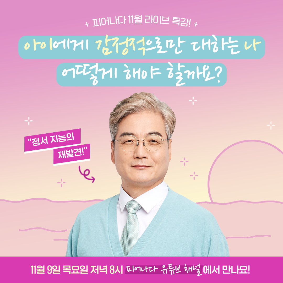 이번 피어나다 ‘라이브 특강 ’에서 아이와 좋은 관계를 유지하기 위해 필요한 “정서 지능”을 키우고 조절하는 방법에 대한 내용을 설명할 예정이다.