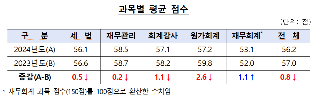 이번 시험에서 응시자의 평균 점수는 56.2점으로 전년 대비 0.8점 하락했으며, 과목별 성적에서는 재무관리(58.5점)가 가장 높고, 재무회계(53.1점)가 가장 낮은 것으로 나타났다.