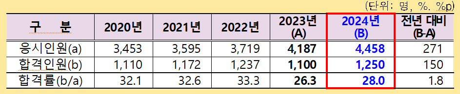 2차 시험 응시인원 4,458명 중 1,250명이 합격해 28%의 합격률을 기록했다. 또한 전년 대비 최종 합격자는 150명 증가했다.