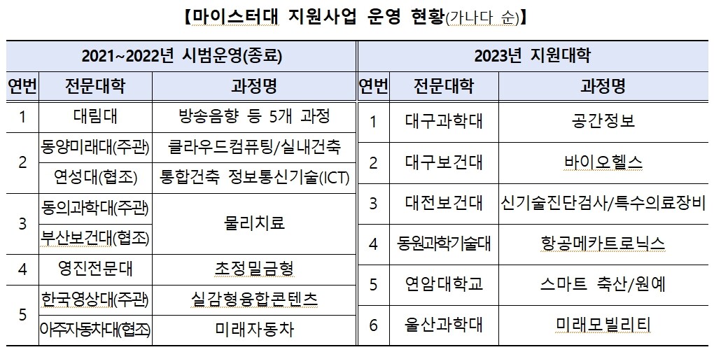교육부는 2021~2022년에 5개교(3개 연합체, 대학 2개교)를 선정해 시범 운영했고, 지난해에는 6개교를 마이스터대로 선정·지원했다. 올해는 전문기술석사과정을 신규로 인가받은 대학 중 3개교를 추가로 선정해 총 9개교(2023년 6개교+신규 3개교)를 지원한다.