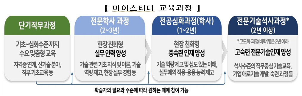 마이스터대는 직무 중심의 고도화된 교육과정을 편성‧운영하는 대학으로 단기직무과정, 전문학사‧전공심화과정, 전문기술석사과정을 모두 운영하고 있는 전문대학 중에서 선정하고 있다.