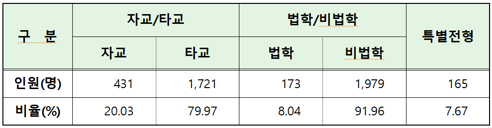 올해 입학자 중 자교 출신은 431명으로 20.03%를, 타교 출신은 1,721명(79.97%)을 기록했다. 또한 법학 출신은 173명(8.04%), 비법학 출신은 1,979명(91.96%)이 입학했다.