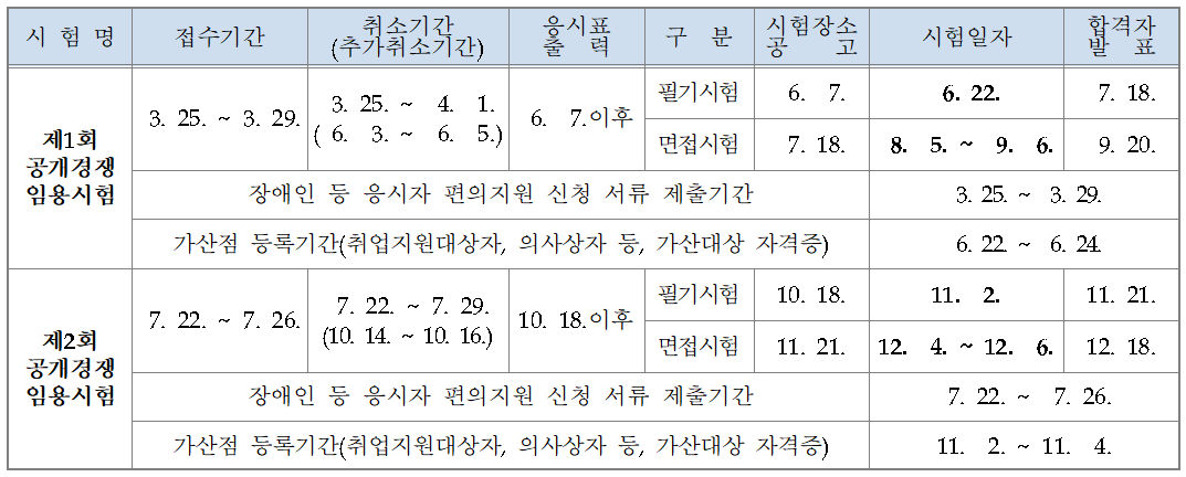 2회 공채는 7월 22일부터 원서접수를 시작하고 10월 18일에 필기시험을 치른 후 12월 18일에 최종합격자를 발표한다.