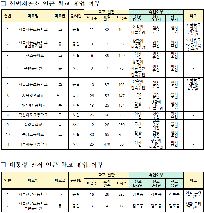 휴업 대상 학교는 ▲유치원 2개원(재동초병설유, 운현유) ▲초등학교 3개교(재동초, 교동초, 운현초) ▲중학교 2개교(덕성여중, 중앙중) ▲고등학교 3개교(덕성여고, 중앙고, 대동세무고) ▲특수학교 1개교(경운학교)**로, 탄핵 심판이 진행되는 헌법재판소 인근에 위치한 학교들이다.