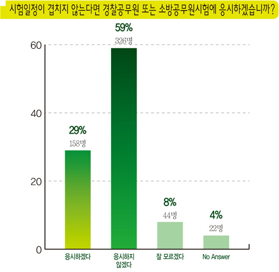 ‘시험일정이 겹치지 않는다면 경찰공무원 또는 소방공무원시험에 응시하겠습니까?’라는 설문에 59%(326명)의 수험생은 ‘응시하지 않겠다’고 답하였다.