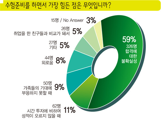 ‘수험준비를 하면서 가장 힘든 점은 무엇입니까?’라는 설문에 응답자의 59%(326명)는 ‘합격에 대한 불확실성’이라고 답하였다.