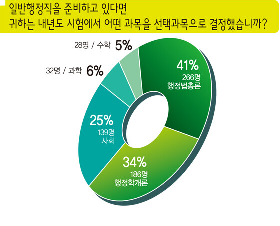 이어 행정학개론이라고 응답한 수험생은 34%(186명)였으며, 사회를 선택하겠다고 응답한 수험생은 25%(139명)였다.