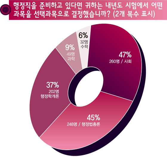 그러나 올해의 경우 ‘일반행정직을 준비하고 있다면 귀하는 내년도 시험에서 어떤 과목을 선택과목으로 결정했습니까?’라는 질문에 응답자의 47%(260명)가 ‘사회’라고 답하였다.